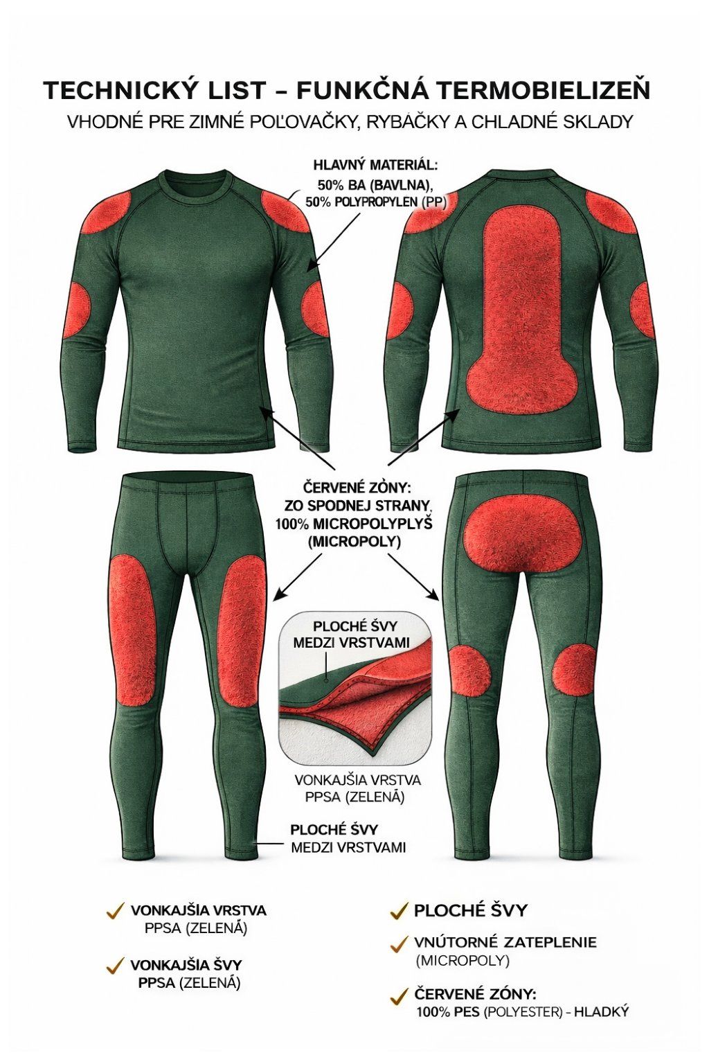 Tričko, ktoré Vás neskutočne zahreje má vďaka anatomickému strihu vynikajúcu schopnosť prispôsobiť sa telu. Základný materiál je inovatívnou zmesou 50% bavlny a 50% polypropylénu, ktorá je známa svojou trvanlivosťou, ľahkosťou a schopnosťou efektívne odvádzať vlhkosť od pokožky, čím sa výborne hodí pre funkčné oblečenie, ktoré udržiava telo v suchu a pohodlí aj počas aktívneho pohybu. Oblasti najviac vystavené chladu, ako sú chrbát, ramená a lakte, sú z vnútornej strany zateplené 100% Micropolyesterom. Tento materiál poskytuje extra hrejivú vrstvu. Všetky zateplené miesta sú obšité plochým švom. Tento typ švu minimalizuje trenie a podráždenie pokožky, čím zabezpečuje maximálny komfort pri nosení. Tričko je výborné pre poľovníkov a rybárov na posed, alebo posedenie pri vode v chladnejšom počasí.