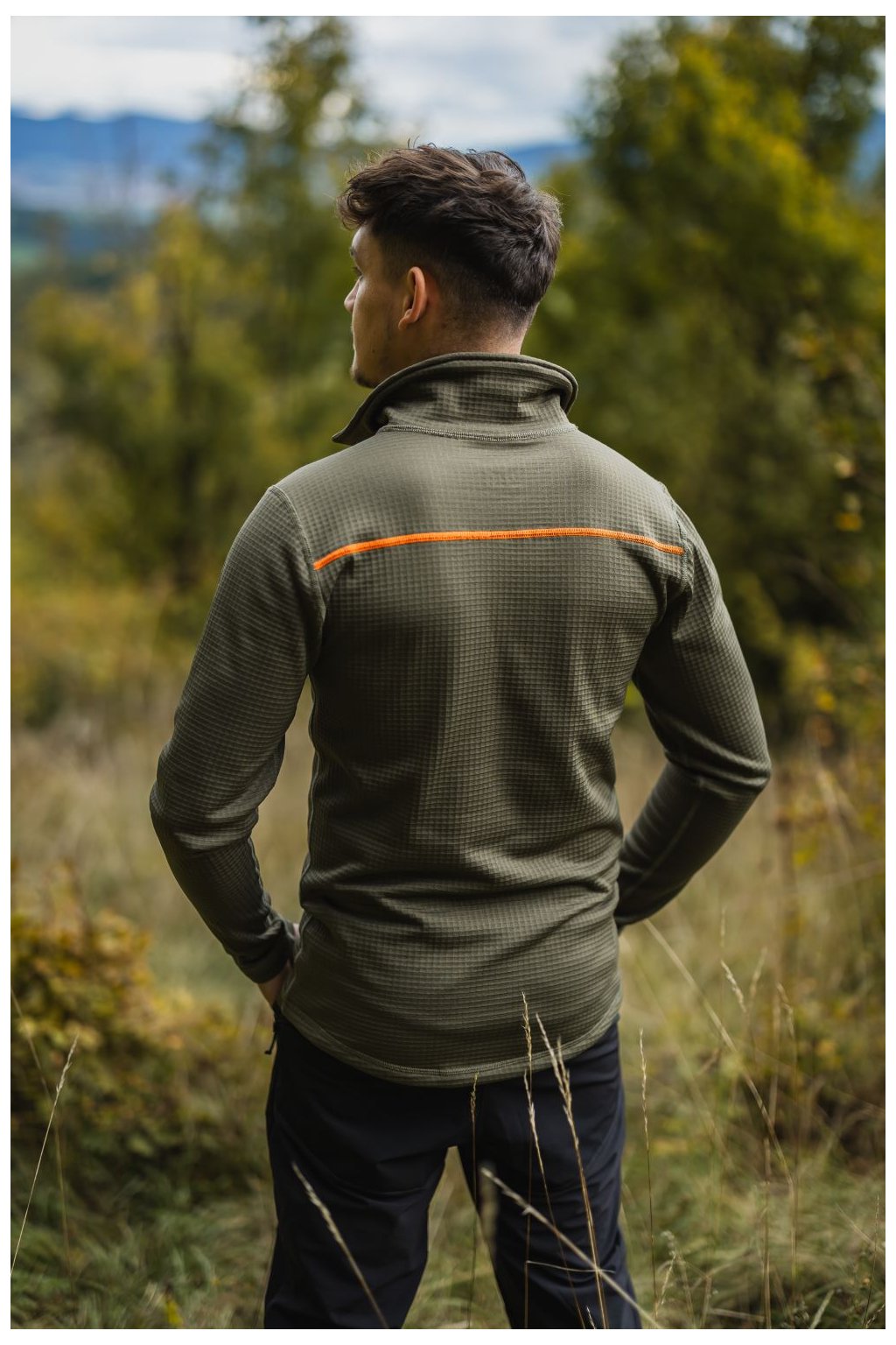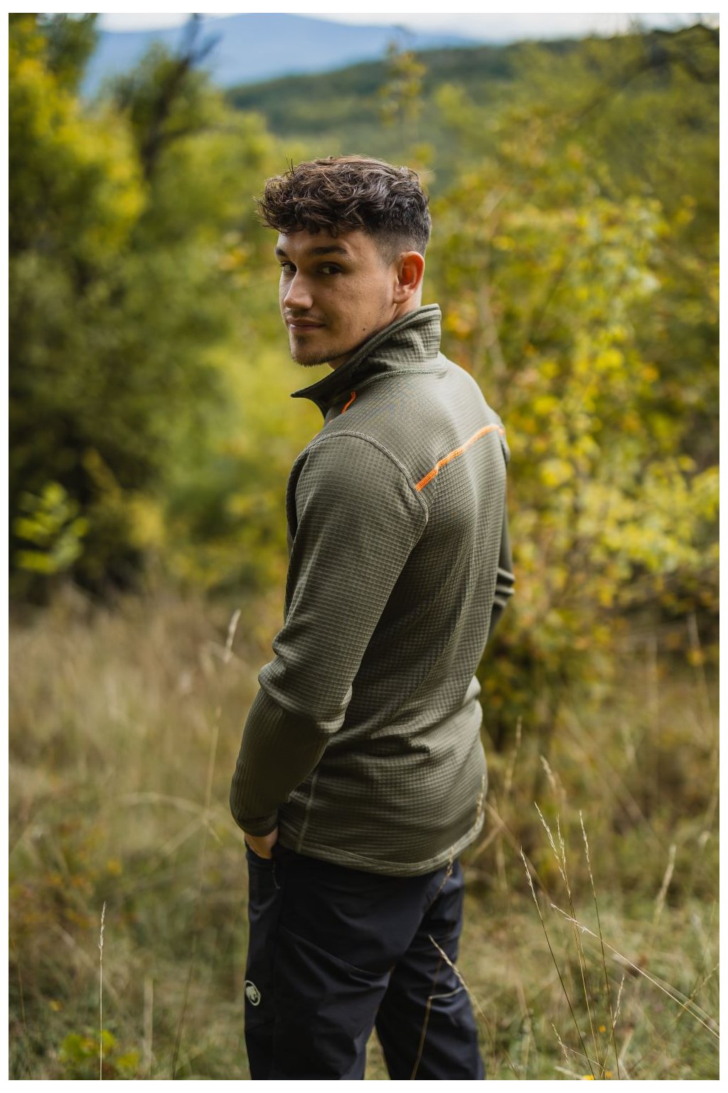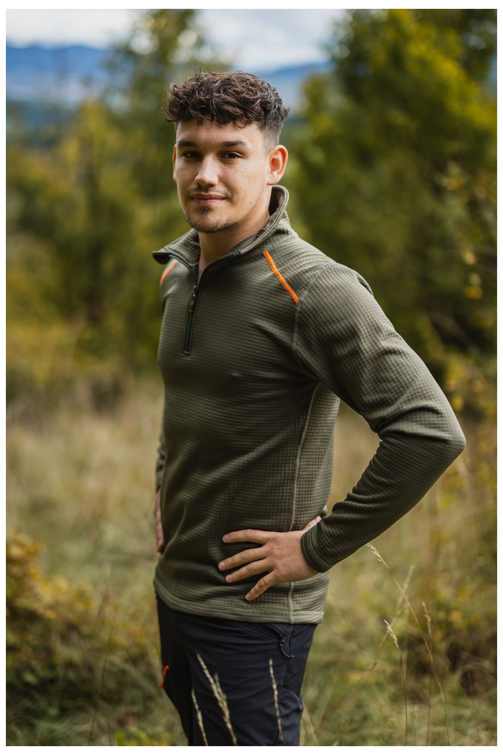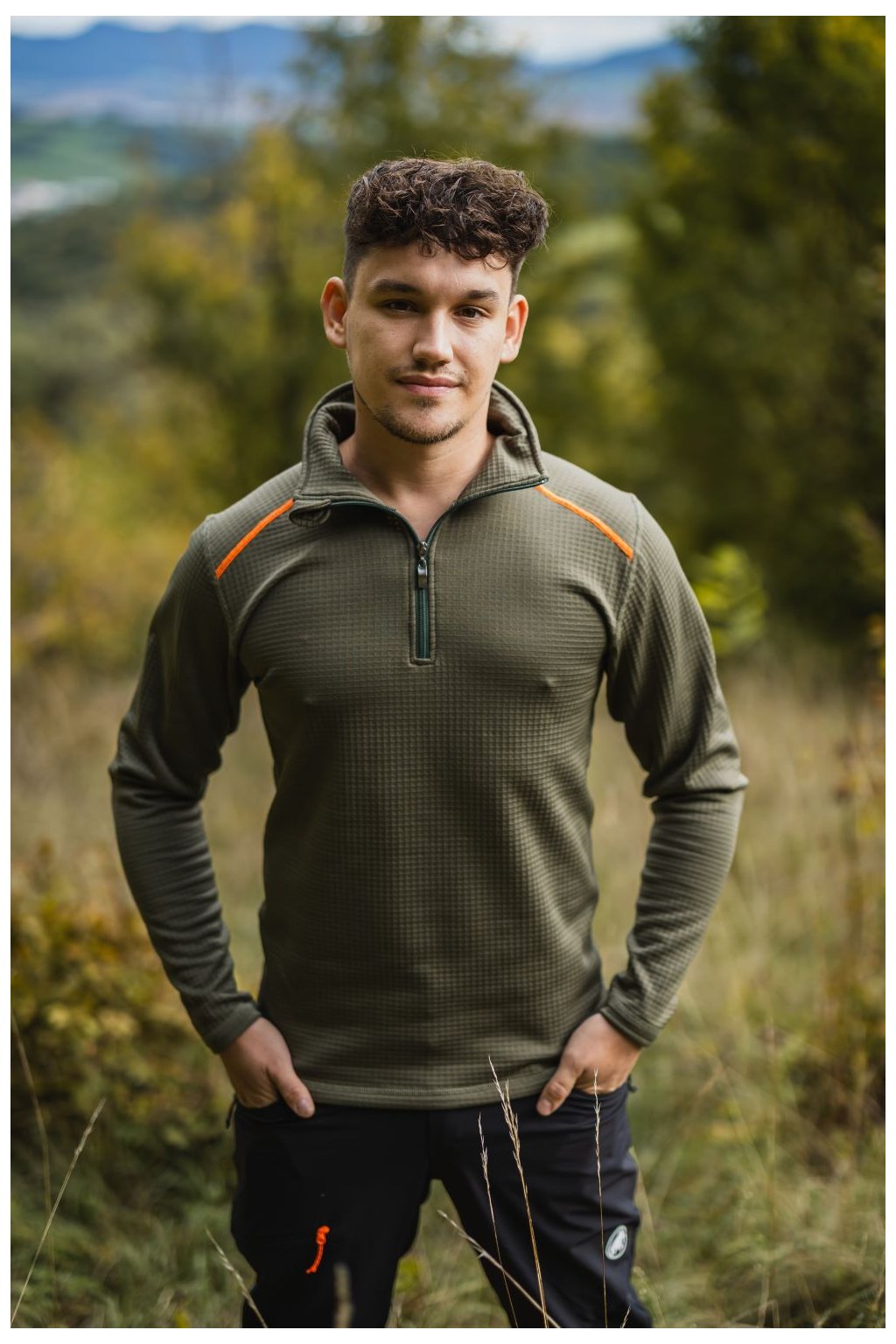 Khaki rolák na zips je vyrobený z jednostranného elastického fleesu s jemným kockovým dizajnom, ktorý je z vnútornej strany jemne počesaný. Táto úprava zaisťuje príjemný pocit na pokožke. Materiálové zloženie zaručuje pružnosť a rýchle schnutie, pričom si zachováva svoj tvar a farbu aj po opakovanom praní. Oranžový štep na chrbte a ramenách dodáva odevu moderný vzhľad a zároveň slúži aj ako dôležitý bezpečnostný prvok, ktorý zvyšuje viditeľnosť v prírode, napríklad pri spoločných poľovačkách, alebo v hustom poraste. Praktický zips pri krku umožňuje ľahkú reguláciu teploty a chráni krk pred chladom. Tento rolák je ideálny ako samostatný kúsok pre poľovníkov, rybárov, alebo ako stredná vrstva pod bundu.